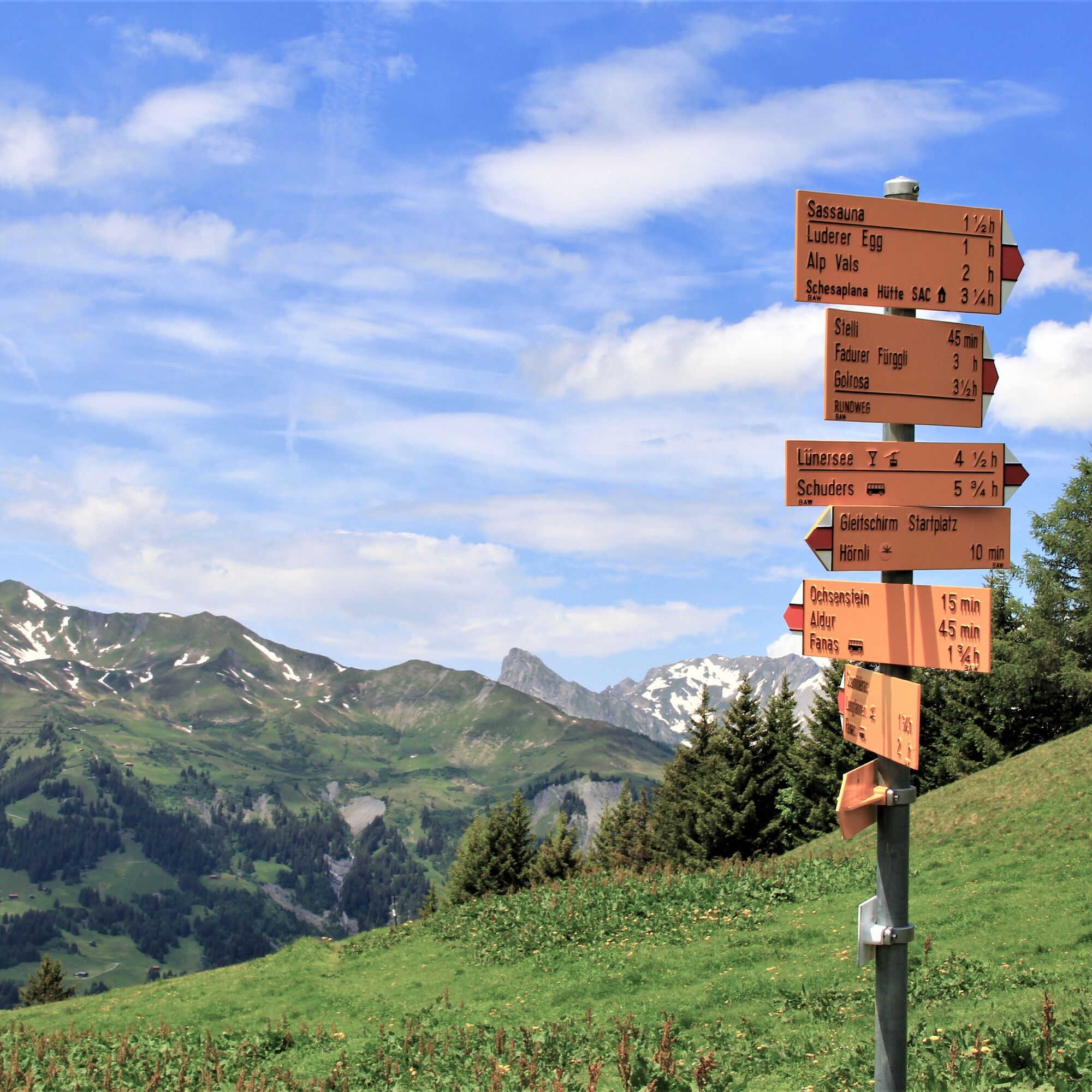 From the mountain station of the Luftseilbahn Fanas a singletrail passes high moor over alpine pastures uphill to Luderer Egg. On this ridge you turn sharply right into a wide basin, which you first cross downhill and then with constant ups and downs. Then it goes downhill longer to the Valser Bach, over which a small wooden bridge leads. Past Vordersäss it goes towards Golrosa. Here fantastic views open up of the Kirchlispitzen and Drusenfluh. At Fadurer Fürggli we switch to the other side of the mountain ridge, where a meadow path with many steep ascents leads back to the SE ridge of the Sassauna. Past the huts near Huoben it goes back over an alpine path to the mountain house Sassauna, which is located directly next to the starting point.