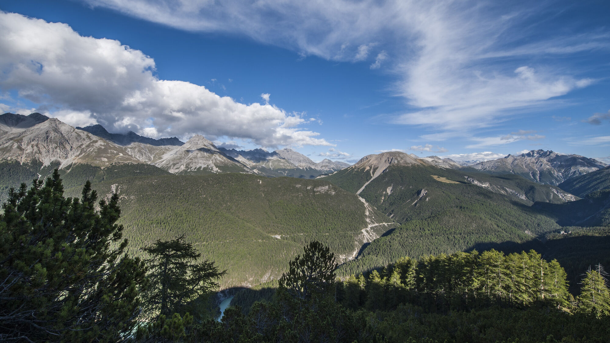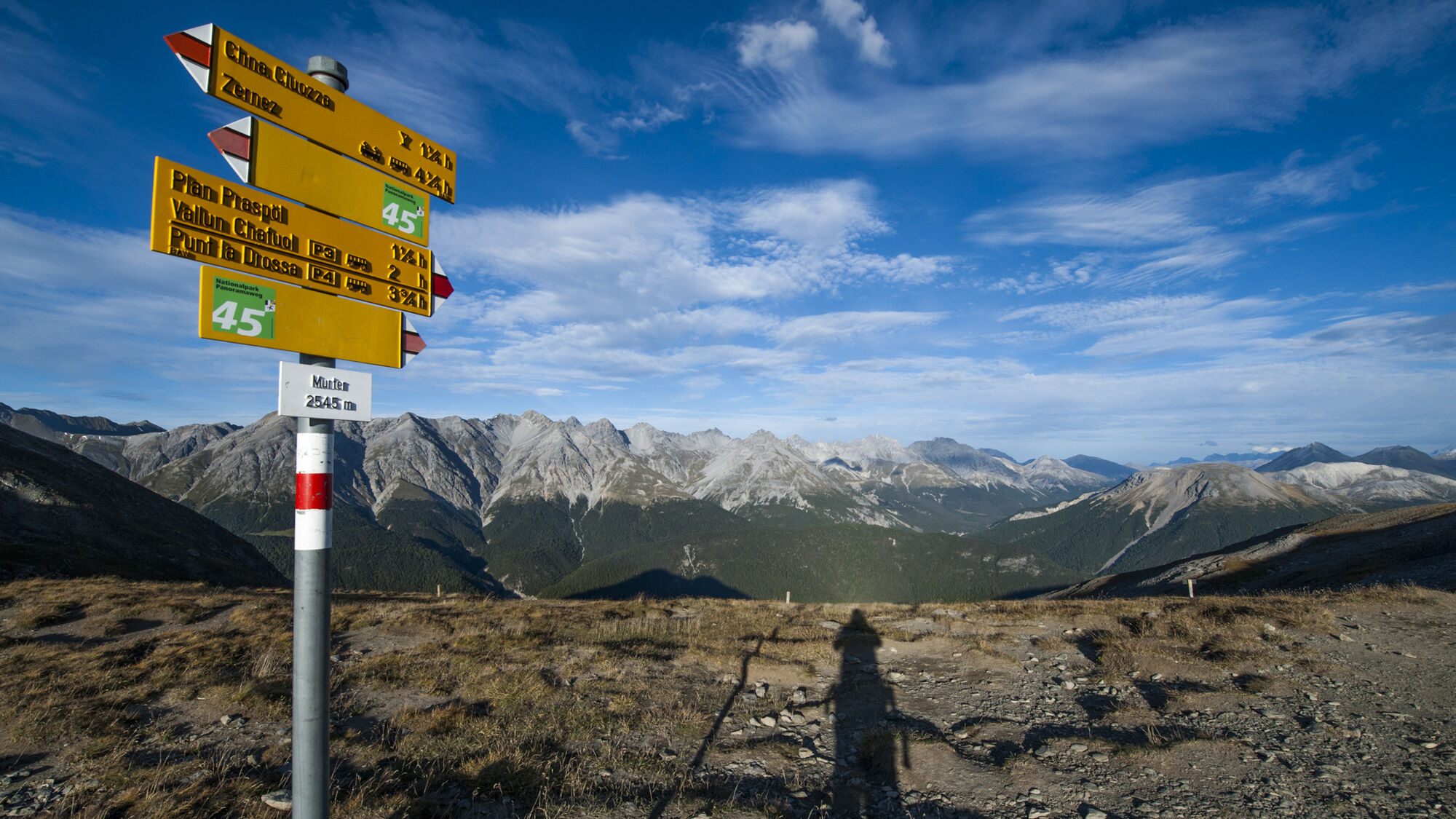 In the morning from the Chamanna Cluozza (1882 m a.s.l.) through pine-larch forest and later through dwarf pine fields uphill. At 2200 m a.s.l. through a steep scree chute – a fixed rope provides support here – and then over the Murter alpine pastures. Cattle used to graze here. Today numerous marmots inhabit the area near the path, which are ideal for observation. At the height of the ruins of the old alpine building, dinosaur tracks on Piz dal Diavel can be spotted with a good pair of binoculars. Shortly afterwards, the path reaches the Murtersattel (2545 m a.s.l.), where a brisk wind often blows. Now the view opens to the Spöl valley and the Engadine Dolomites. The descent begins steeply and leads past ruins of former alpine buildings once again at Plan dals Poms. After this terrace begins the seemingly endless zigzag path through dwarf pine stands and later through a magnificent larch, Swiss stone pine, spruce, and pine forest. At the clearing of Plan Praspöl (1690 m a.s.l.) the valley floor is almost reached. Only 10 minutes to the bridge over the Spöl, where the final ascent to the PostAuto stop «Vallun Chafuol/P3» begins.