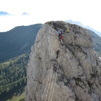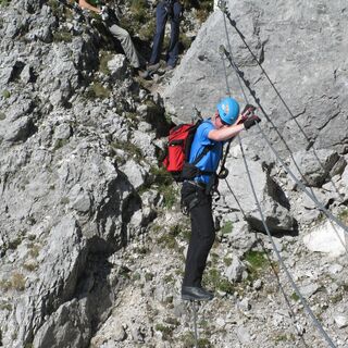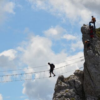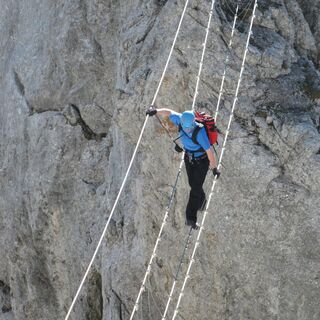 The secured via ferrata with difficulty level B/C (two sections C) is about 500 meters long. To reach the highest point of the "Däumling," 150 - partly spectacular - meters in altitude must be overcome. The via ferrata offers not only an incredible atmosphere but also some rope bridges, including the 40 m long Nepal Bridge at about 100 m height.