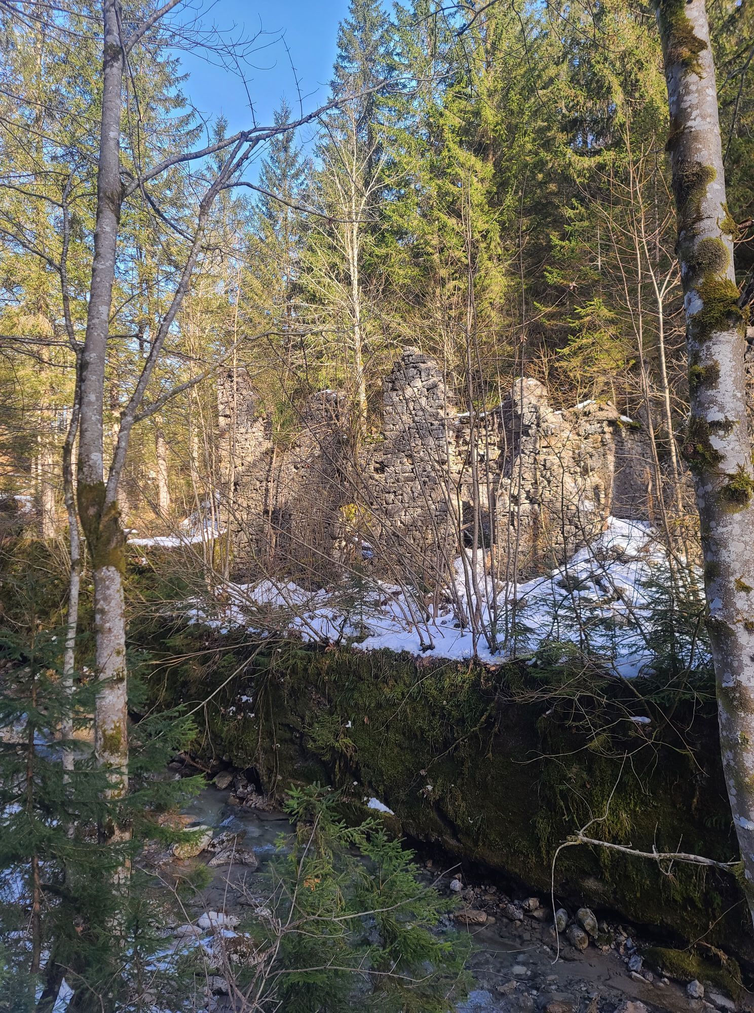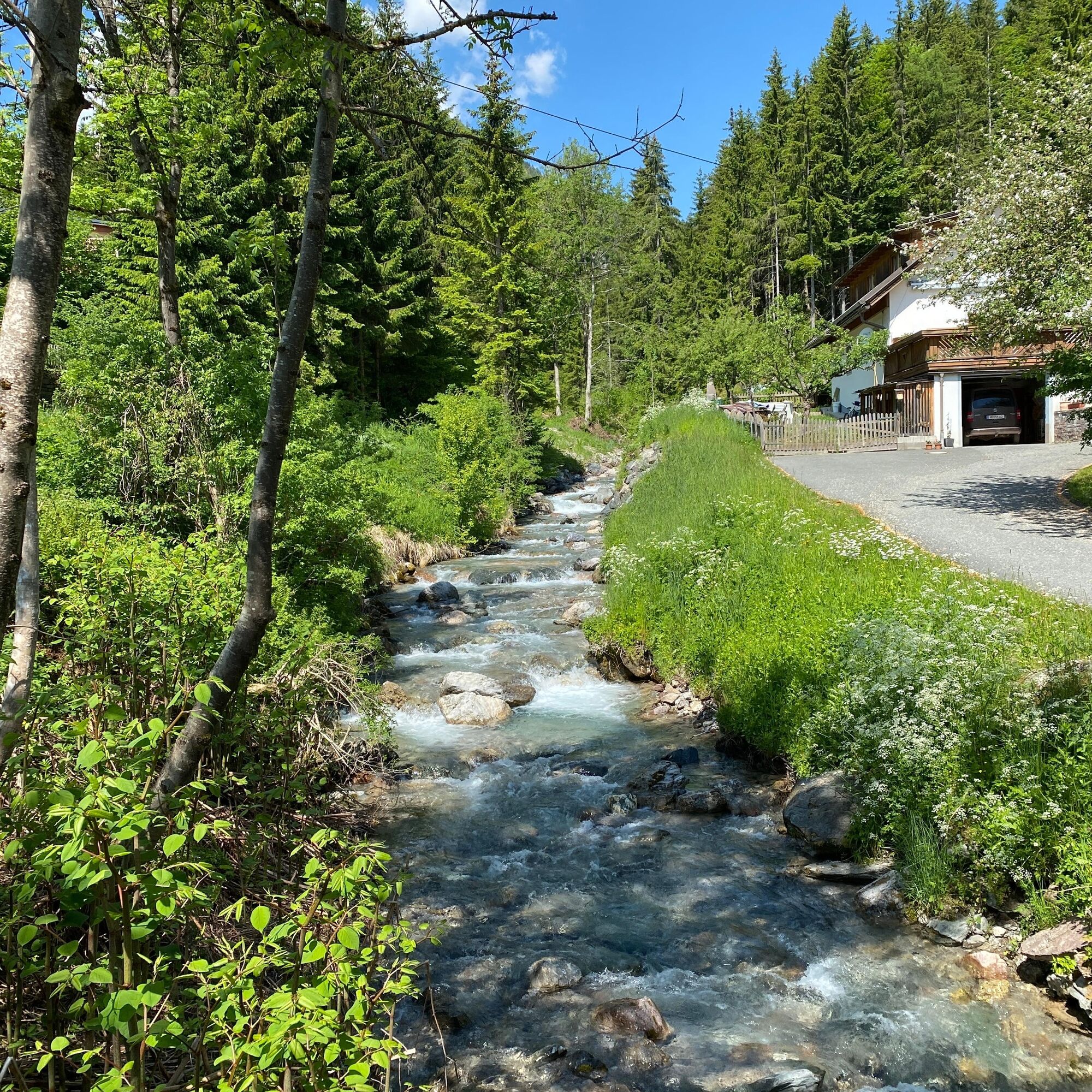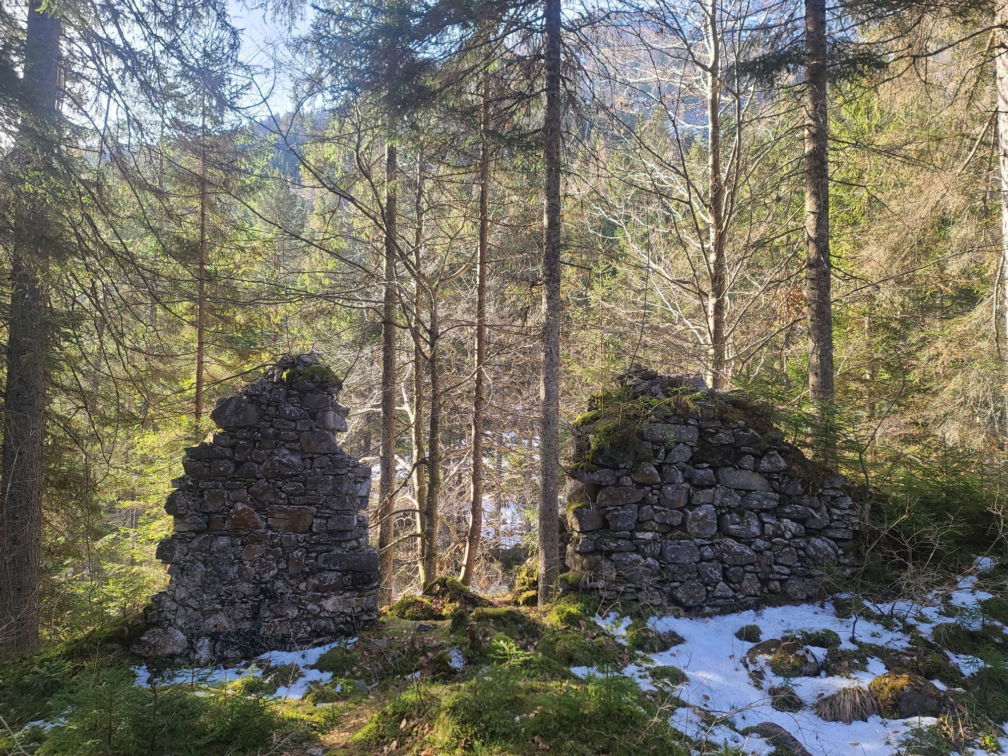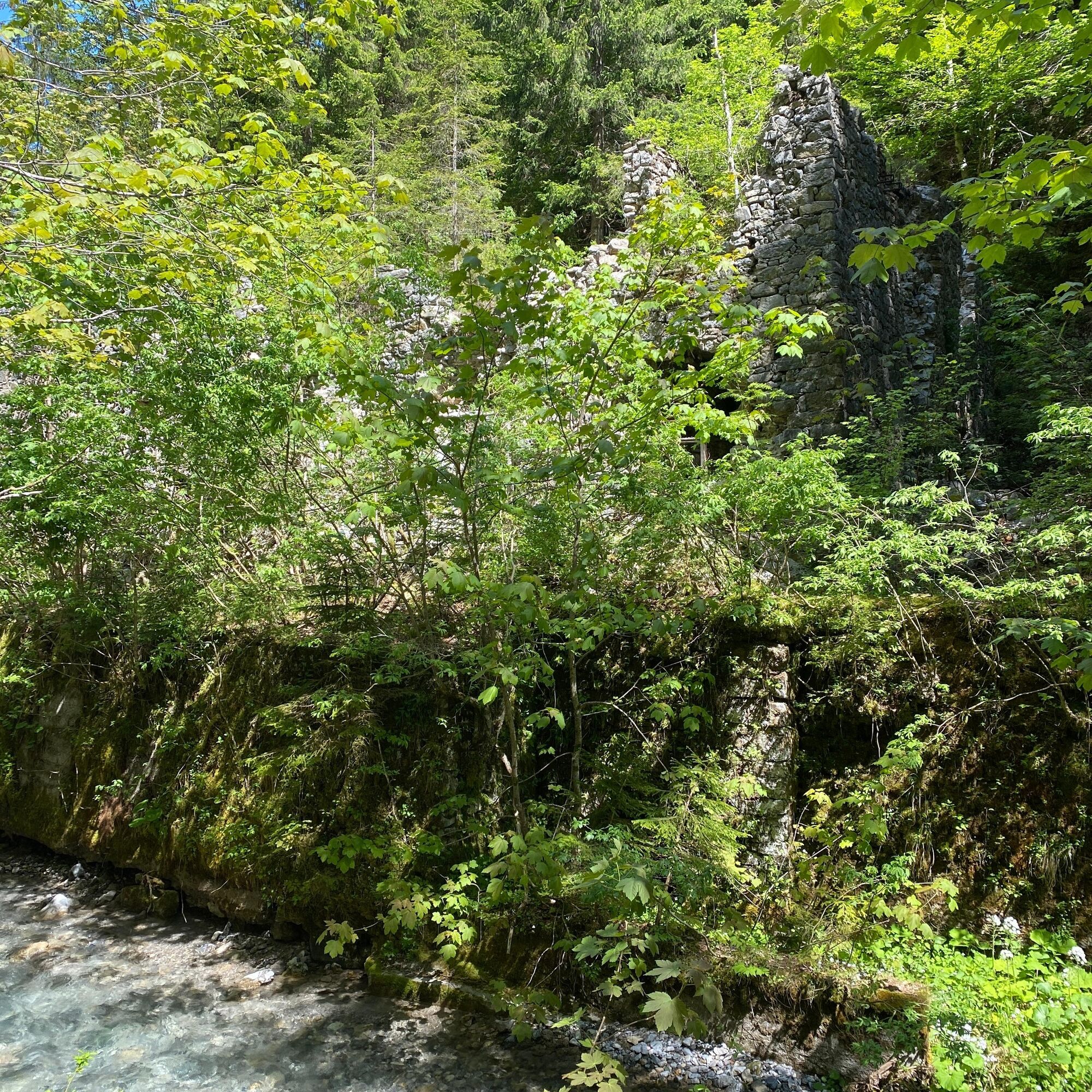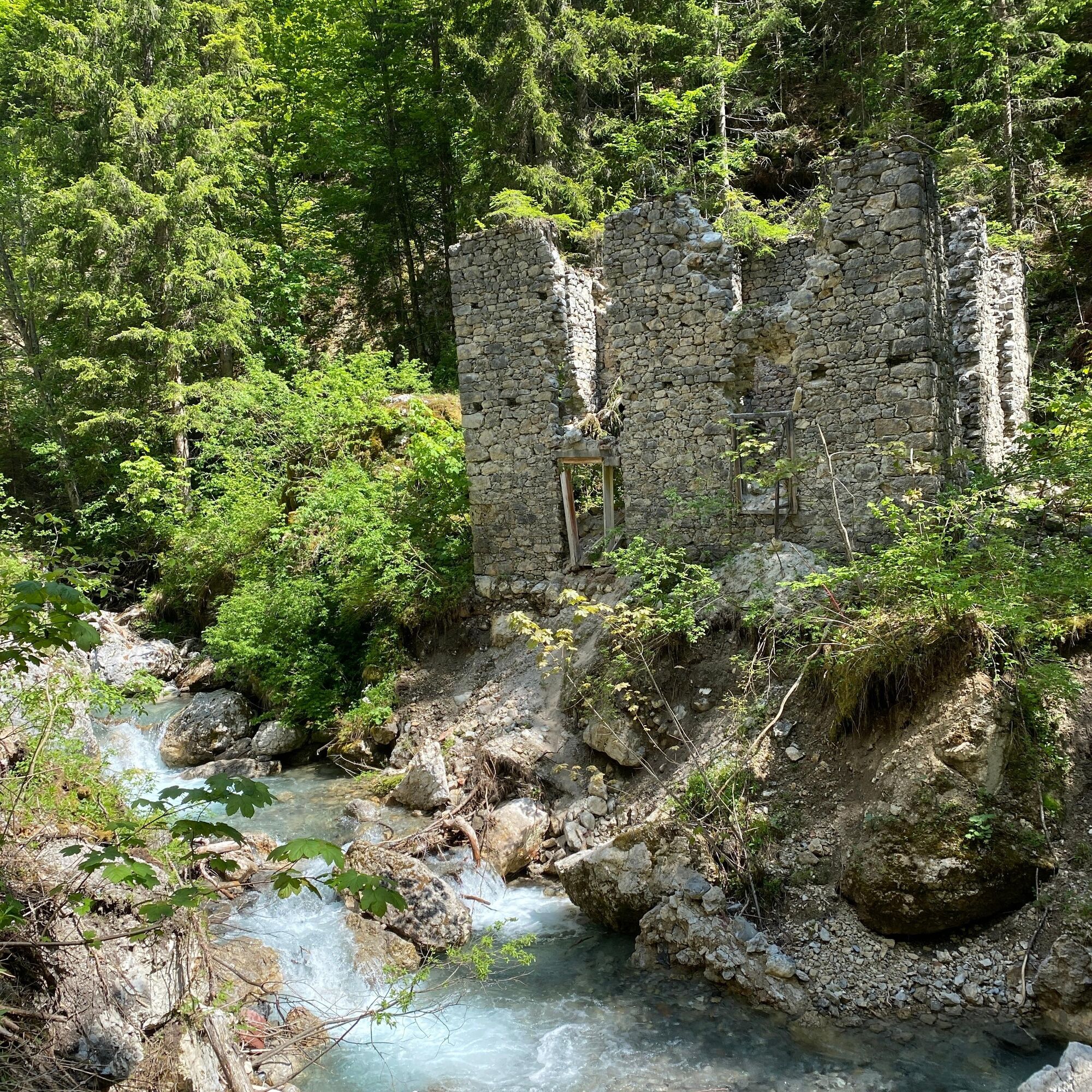 After the municipal office in Weißbriach, still before the bridge turn left along the stream to the Gössering gorge, past the old ruins to the "Großen Hammer" ruin. From here there are two options to reach the Waisacher Alm (operated).