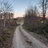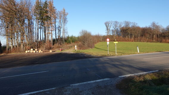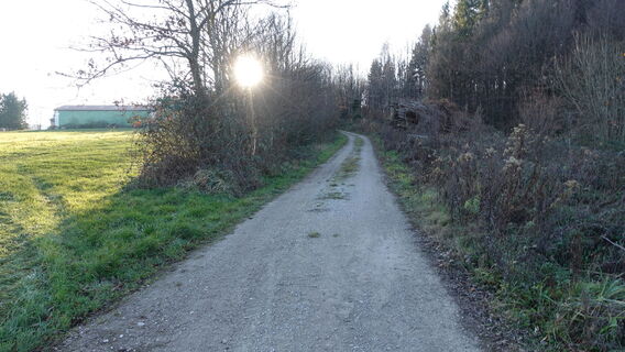 Nun rd. 220m entlang der der Straße flach ansteigend nach oben, dann gegenüber dem Busumkehrplatz rechts in den geschotterten Waldweg weg sanft nach oben weiter.