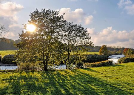 Die moderate Tour startet mitten in Hennef: Nach einer kurzen Passage durchs beschauliche Kleinstadtzentrum erreicht ihr den langgezogenen Bogen des Siegdamms, der entlang alter Linden durch eine friedliche Auenlandschaft führt. Zwischen Weingartsgasse und Seligenthal sind an der Sieg die Relikte der „Grube Ziethen“ zu sehen, in der man einst nach Bleierz grub. Bergauf führt euch ein Feldweg mit Landschaftspanorama oberhalb der verwilderten ehemaligen Weinbergterrassen zu einem höher gelegenen Rastplatz. Dort genießt ihr eine fantastische Aussicht und erhaltet interessante Informationen zur Siedlungsgeschichte zwischen Rhein und Sieg. Weiter führt ein Serpentinenpfad steil bergab in ein kleines bewaldetes Bachtal. Weiter geht’s erst steil, dann gemäßigter auf der anderen Talseite bergauf, wo bald der Kirchturm des hübschen Dörfchens Happerschoß in Sichtweite gerät. Ein Feldweg führt auf dem Mühlenberg zwischen Äckern und Wiesen hindurch, auf der einsamen Höhe erhaltet ihr überraschende Einblicke in die historische Kulturlandschaft. Im Anschluss führt euch die Route erneut ein Stück hinab in ein Kerbtal. Auf teils steilen Pfaden geht es am Rande des Örtchens Allner vorbei an den mächtigen Mauern einer einstigen Wasserburg und den Überresten einer Getreide- und Ölmühle am Siegufer. Entlang der Sieg und durch die Auen gelangt ihr zurück zum Bahnhof Hennef.