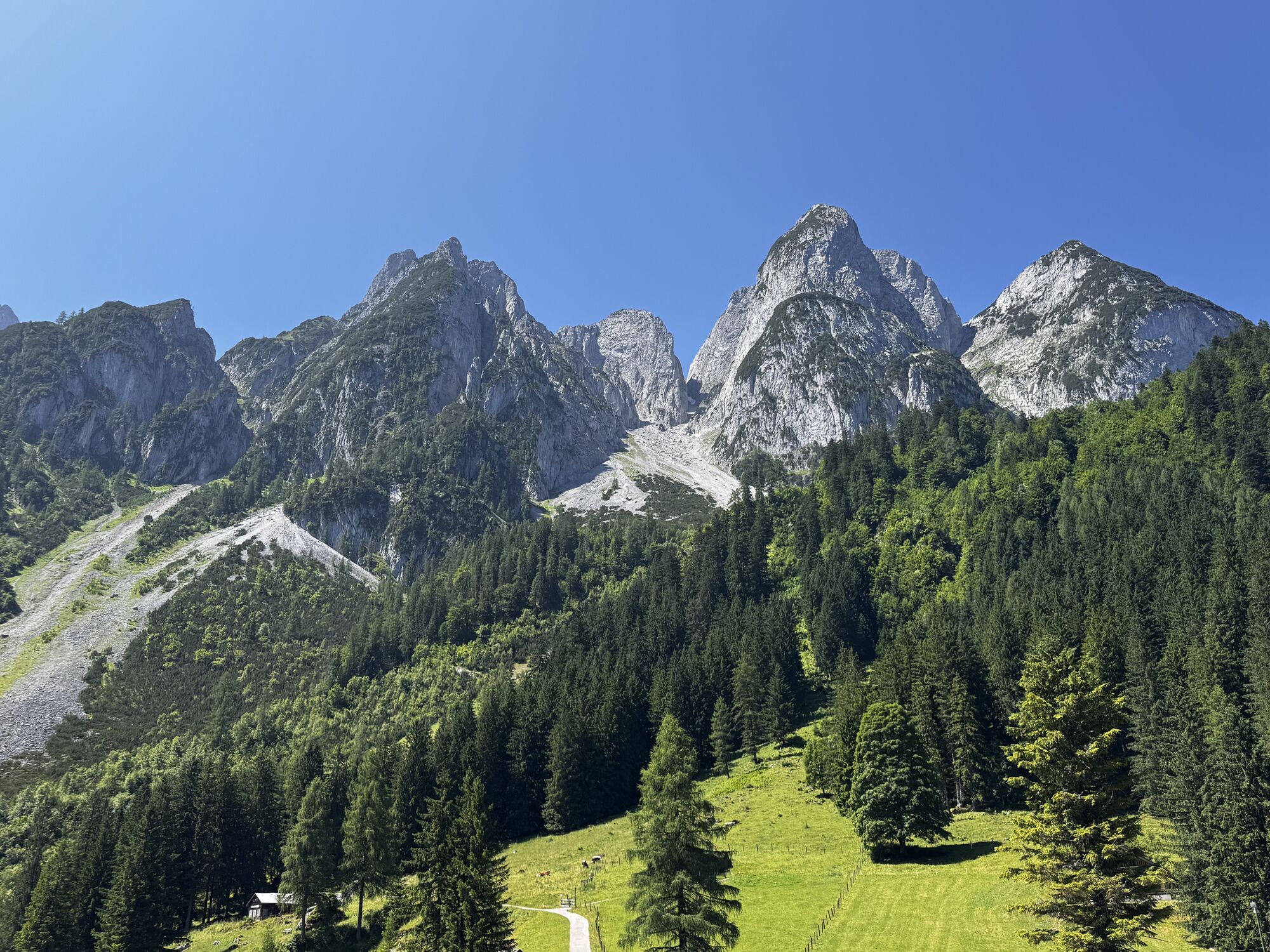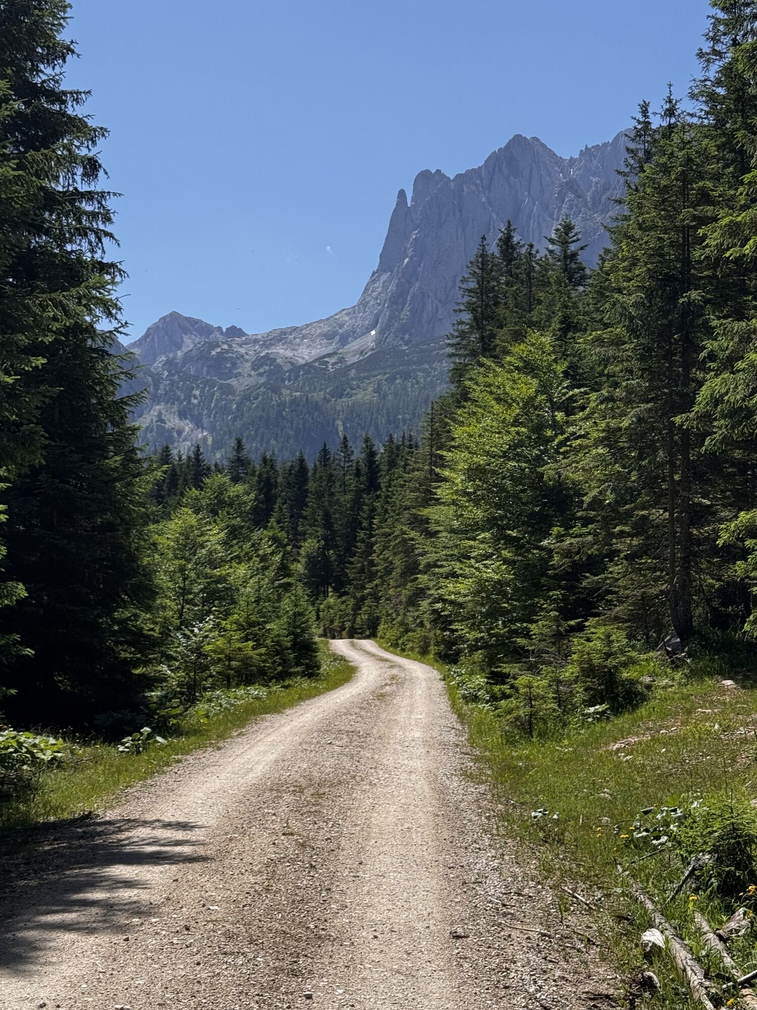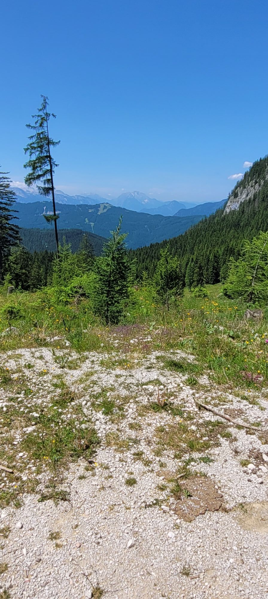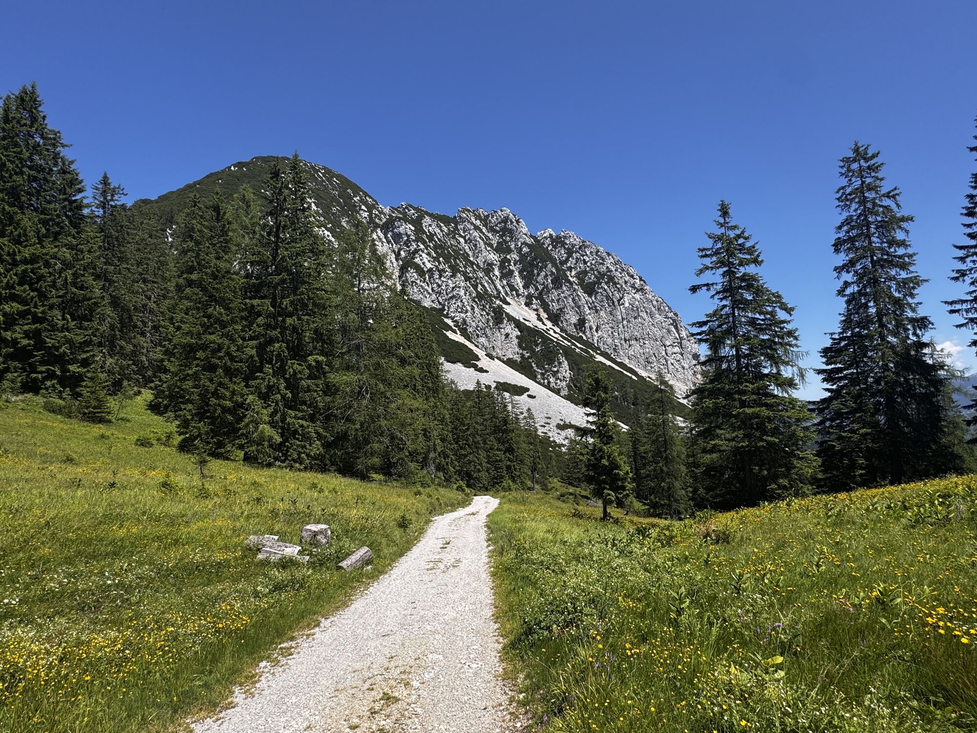 Bald Abzweigung in Schotterstraße zur eigentlichen Tour. Bei der Ebenalm 1157m gäbe es eine erste Rastmöglichkeit. Der Abstecher ist aber sehr steinig und es gibt auch Steinplatten.