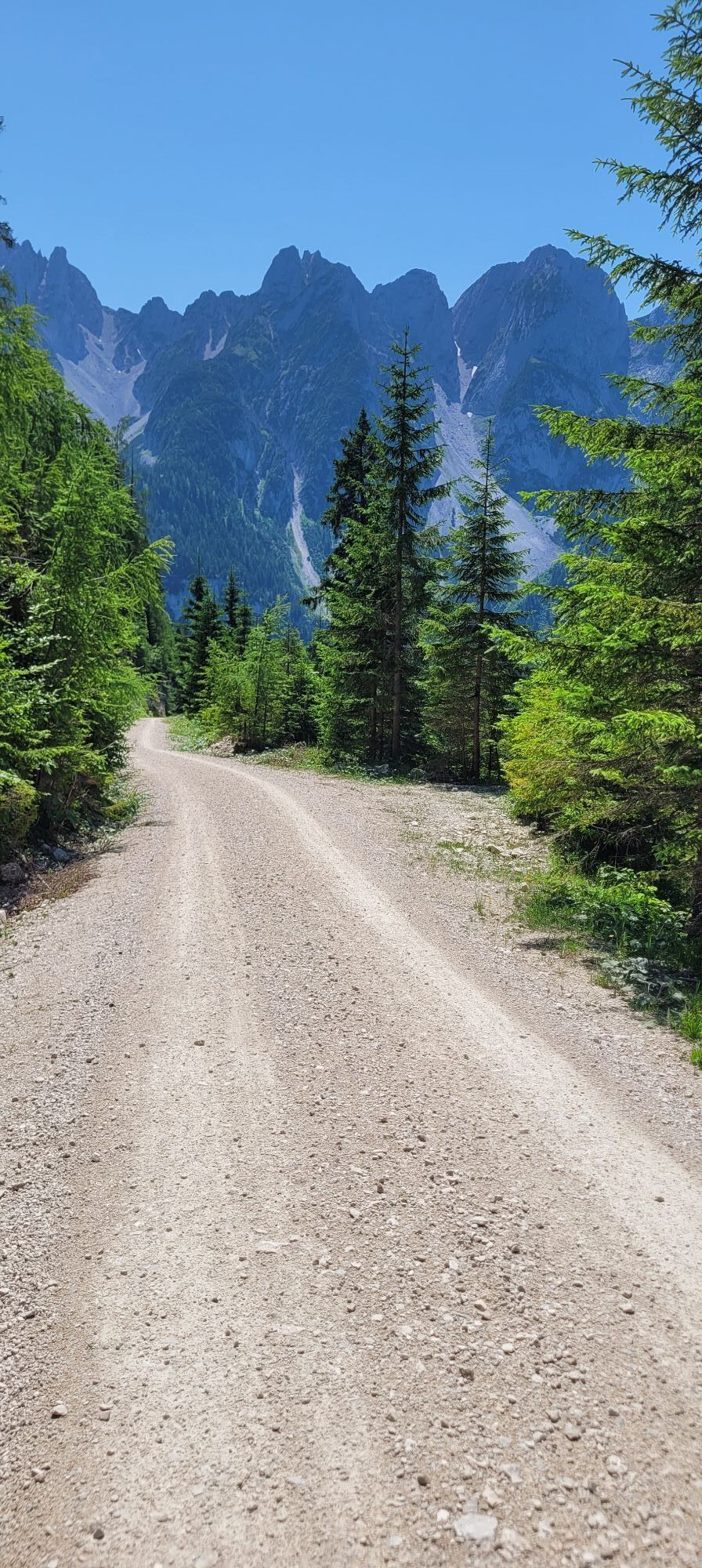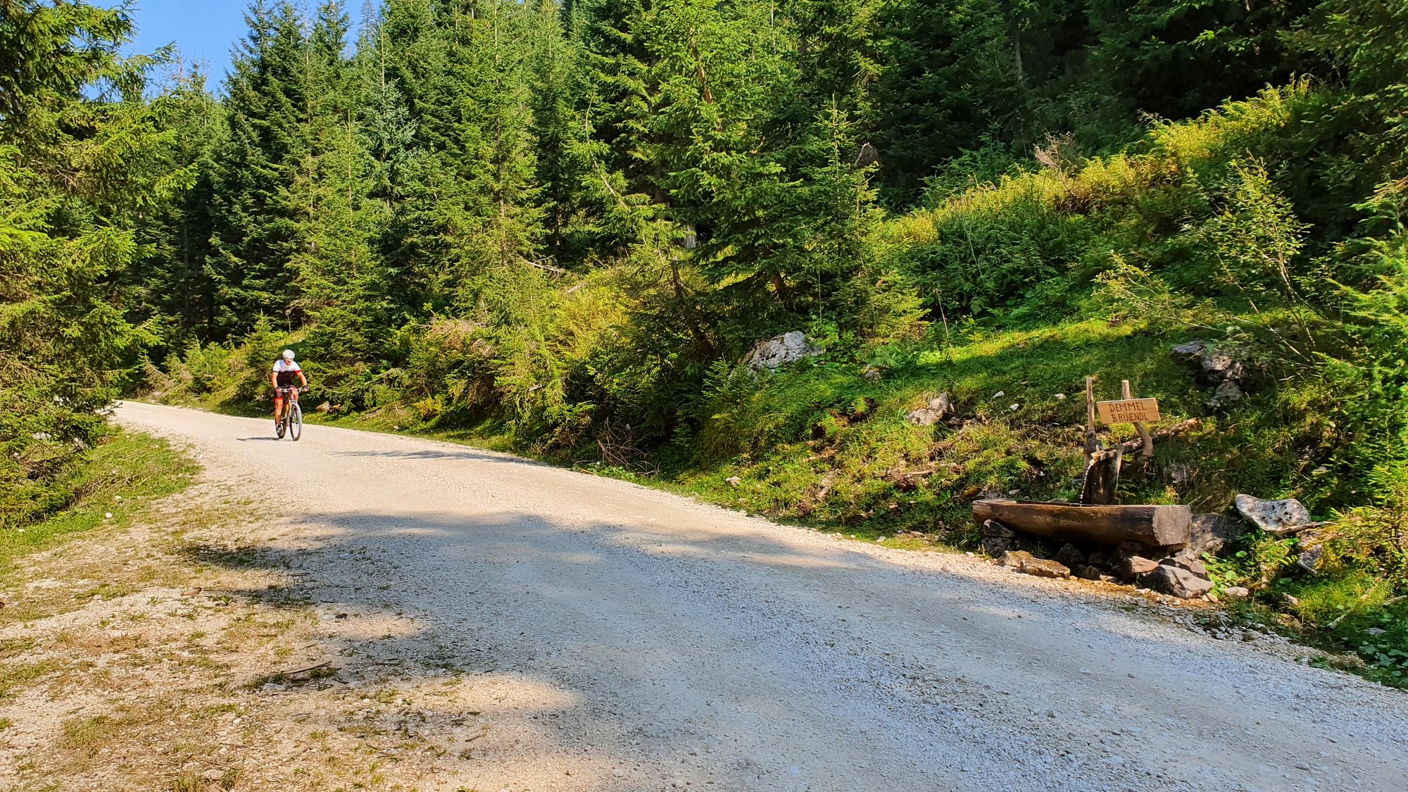 Nach der Abzweigung Richtung Gosau gibt es aber links die Möglichkeit eine Forststraße zu nehmen; der steile, rumpelige Anstieg am am Beginn ist nur kurz. Danach geht's wieder für 2 km über die Hauptstraße, bis man über eine Brücke bei einem Fischteich auf die andere Seite des Gosaubaches kommt und bis zum Ziel autofrei bleibt.