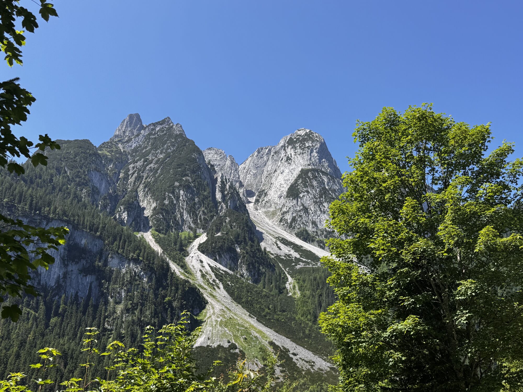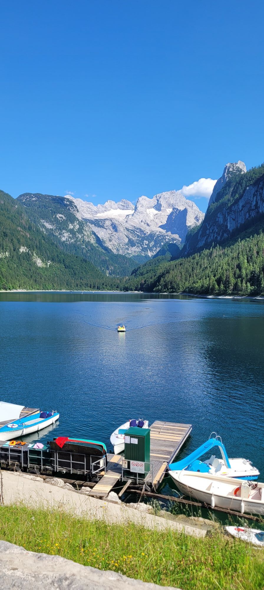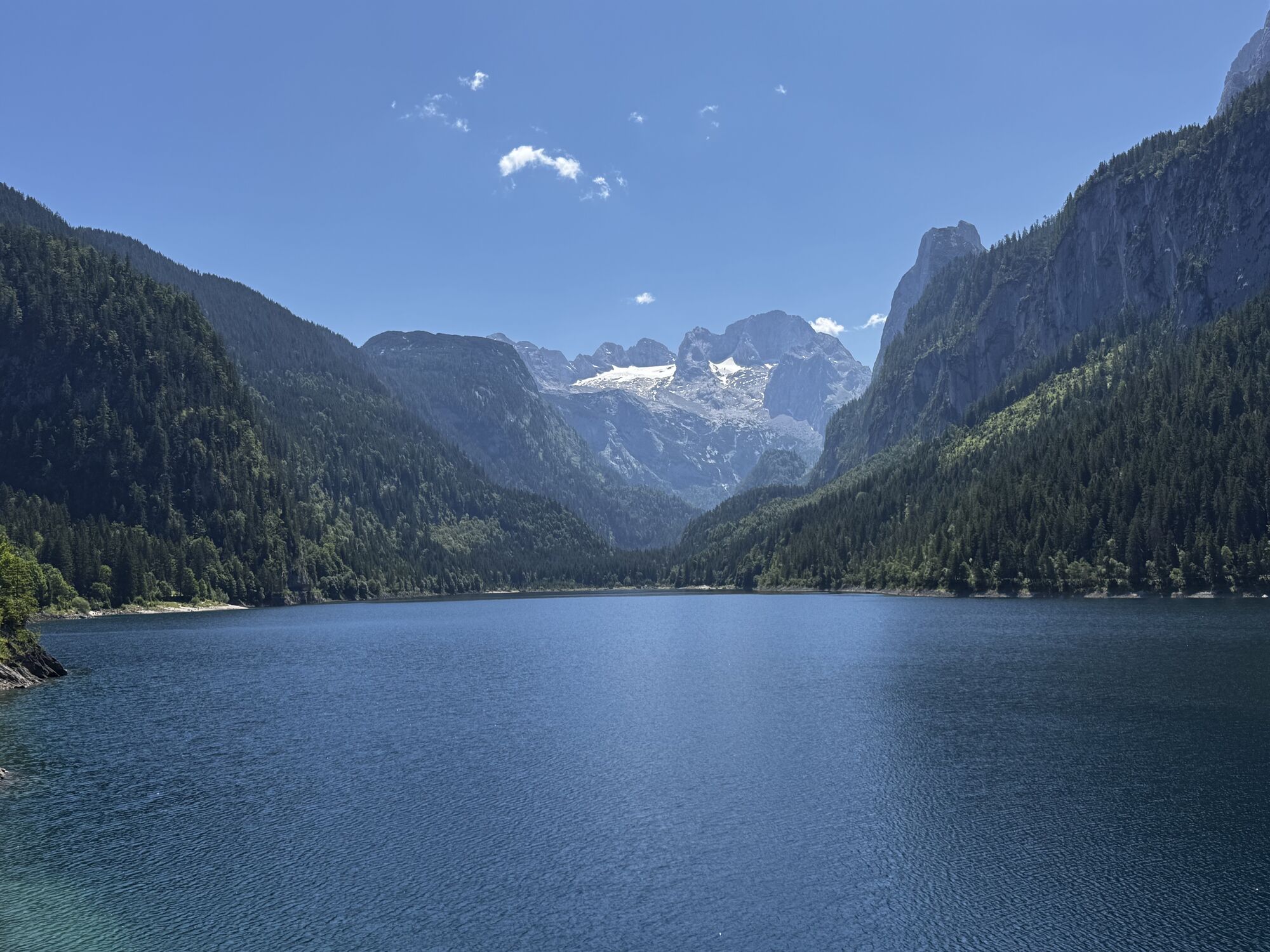 Zum Vorderen Gosausee durchaus steiler die Autostraße hinauf, dann am wunderschön aus Felsen gehauenen Uferweg weiter.