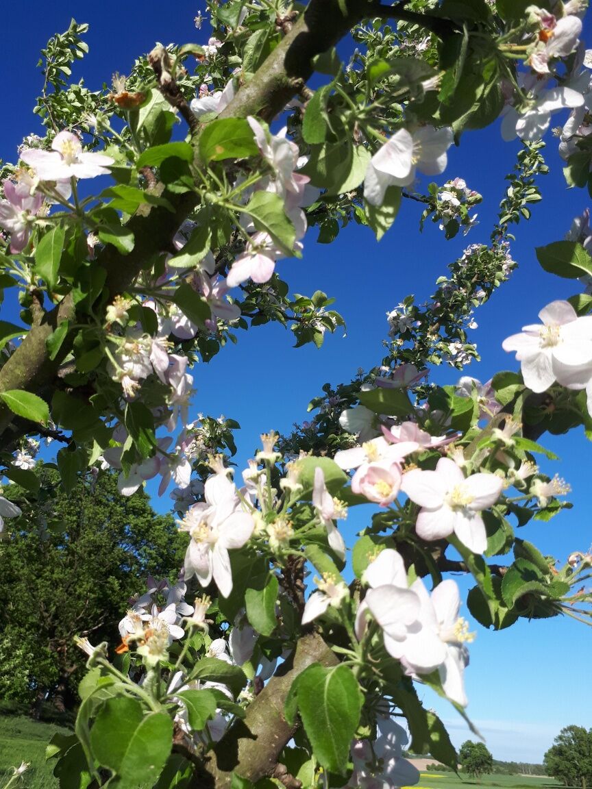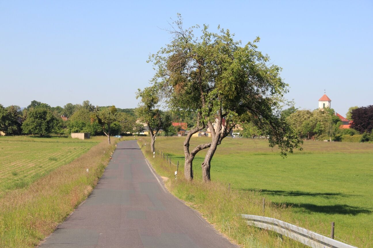 Gestärkt machen wir uns auf den Weg nach Kleinbautzen, wozu wir an der Kreisstraße rechts und kurz danach links abbiegen. In Kleinbautzen wirkte Pfarrer Adam Gottlob Schirach, dessen Engagement für die Bienenzucht ein schön gestaltetes Denkmal mit Rastplatz gewidmet ist. Von Kleinbautzen aus fahren wir auf der Kreisstraße gerade aus weiter und biegen nach dem Dorf links auf die Straße nach Cannewitz ein. Auf dieser Straße steht ein alter Bestand an Straßenbäumen der regionalen Apfelsorte “Lausitzer Nelkenapfel, der dem touristischen Radwanderweg den Namen gegeben hat. In Cannewitz angekommen erreichen wir mit der Apfelscheune das Zwischenziel des Radwanderweges.