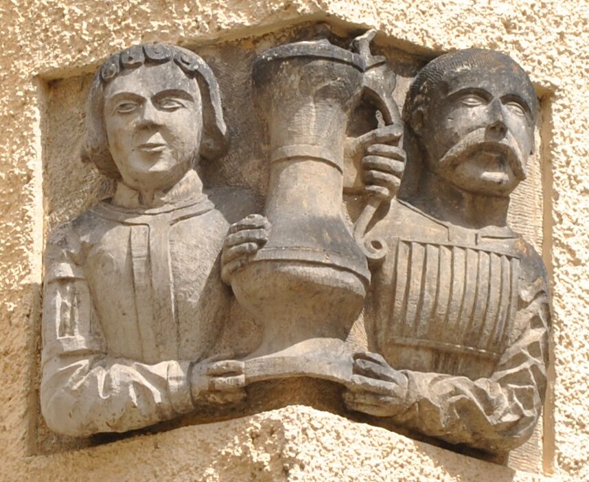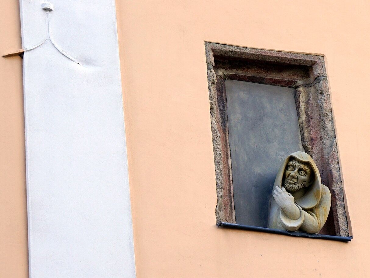 Continue via Neißstraße past the Biblical House to the Hainwald. At the corner Neißstraße and Kränzelstraße you will see two men holding a jug together on the upper floor of the corner house. Walk past the "Neidecke" and Hainwald to St. Peter's Church.