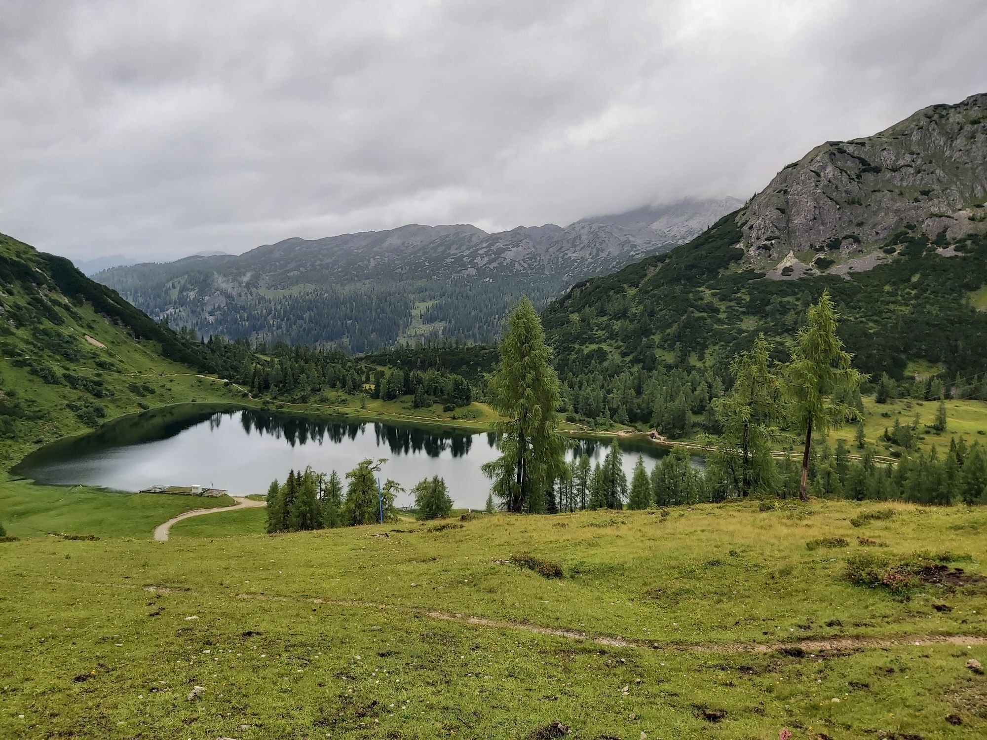 Das Gelände wird nun zunehmend flacher bis das Tauplitzalm Almplateau erreicht ist. Hier kann man bereits das Ziel der Tour, die Bergstation der 4er Sesselbahn Tauplitz, sehen.