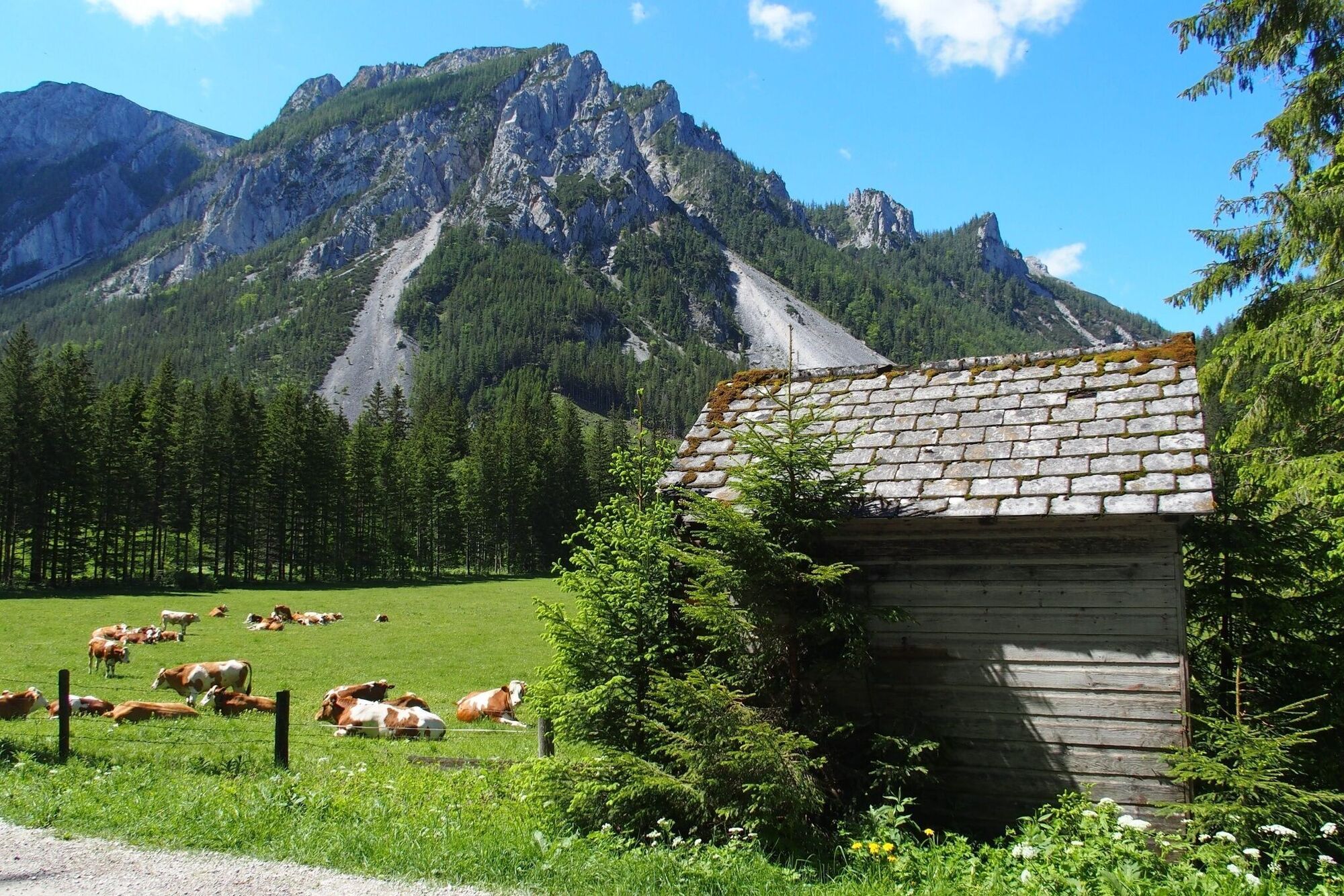 Die Wanderung in dieJassingalm startet am Parkplatz Grüner See. Von dort spaziert man vorbei amGrünen See in Richtung Jassing.