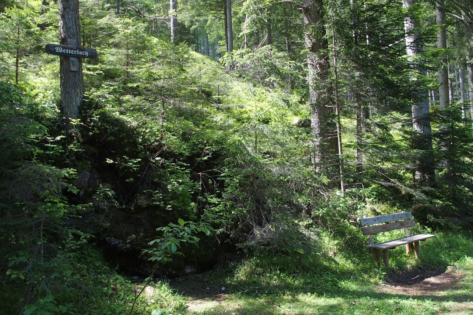 Nach dem See zweigt man nach ca. 500 m rechtsab in die alte Jassingstraße. Der Weg führt durch waldiges Gebiet und man kommtam Wetterloch vorbei.