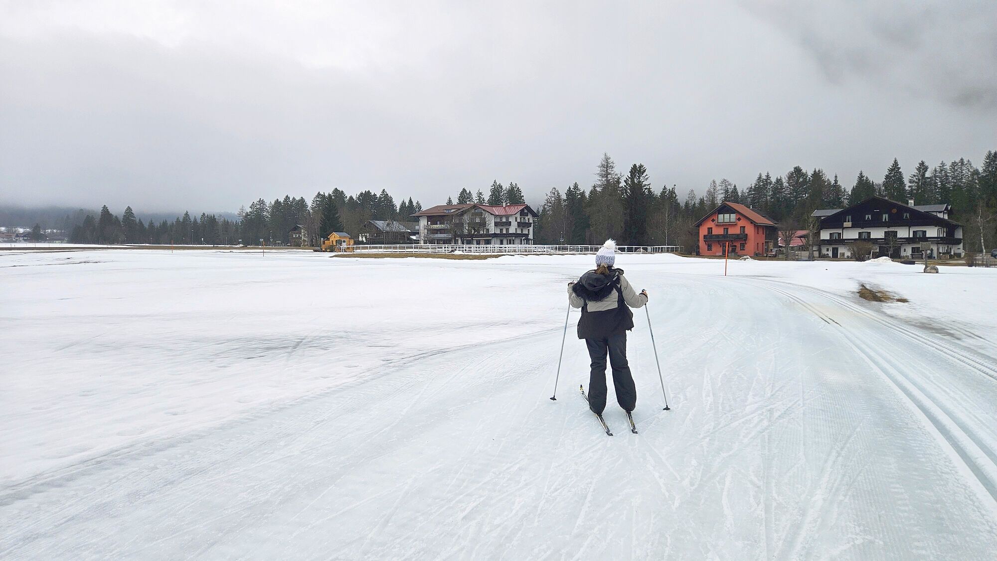 Einkehr entweder beim Hinweg oder Rückweg auf halber Strecke in der Nähe der Unterführung in Platztl beim Gasthaus Zugspitze. Am Umkehrpunkt die A6-Loipe weiter bis zum Alpenbad und zurück über die Snowfarmingloipe auf der anderen Seite der Leutschach.