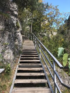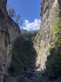 Über den Ehnbachklammweg hinauf, über die kleine Staumauer auf den Brunntalweg und rechts den Fahrweg hinunter.Durch die Klamm schmaler Weg, teils mit Seilgeländer und kniehohen Stufen. Manchmal Gitterstufen....